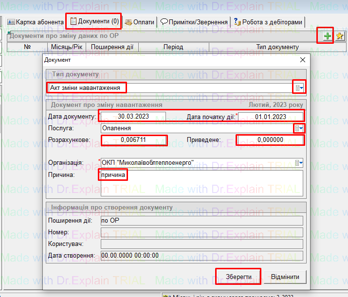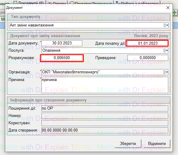 4. Тип Документу вибрати “Акт зміни навантаження”,