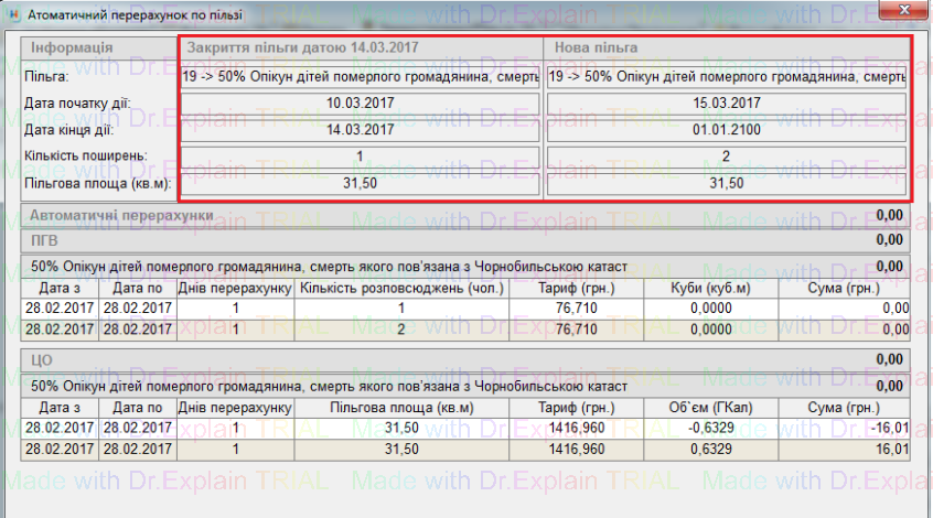 - дату початку дії пільги змінити на дату, з якої діють нові зміни в пільзі, нажати Зберегти, відкриється вікно "Автоматичний перерахунок по пільзі". У цьому вікні вказується дата кінця дії пільги (до внесених змін), і відображено інформацію про цю ж пільгу з новими значеннями: