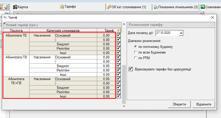 Також потрібно буде проставити тарифи по будинку по послугам: Абонплата ТЕ, Абонплата ГВ, Абонплата ТЕ + ГВ: