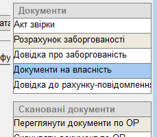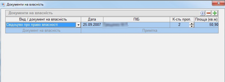 Документи на власність — можна додати/видалити/коригувати та продивитись історію змін (завдяки панелі знаків - "плюс, мінус, І") документів на власність, заповнюючи поля: вид документа, дата його складання, ПІБ, кількість прописаних і площа.