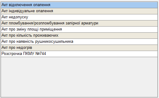 - у графі "Тип документу" вибрати "Акт індивідуальне опалення" (подвійним кліком миші)