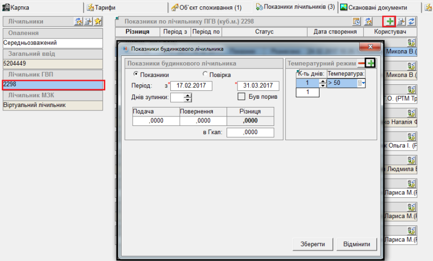 * в полі "Показники по лічильнику ПГВ" нажати кнопку "+", відкриється вікно "Показники будинкового лічильника", в якому заповнюємо наступну інформацію: