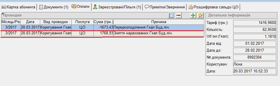 В картці ОР (даного будинку, по якому робили коригування показника будинкового лічильника), у вкладці "Оплати" буде створено дві проводки "Коригування Гкал"