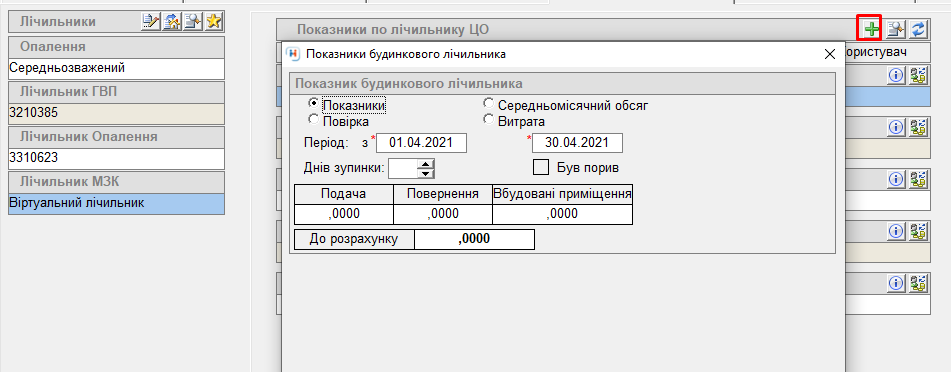 У вікні "Показники будинкового лічильника" заповнити: Подача, Повернення, Вбудовані приміщення. Нажати Зберегти. Різниця підрахується автоматично