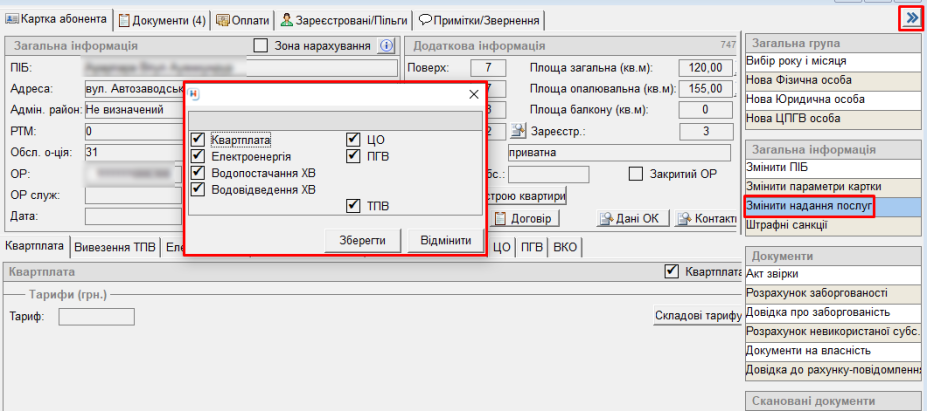 Для того, щоб налаштувати надання послуг по особовому рахунку: кнопка дві стрілочки (додаткові функції) - Змінити надання послуг - проставити потрібні галочки, та натиснути "Зберегти":