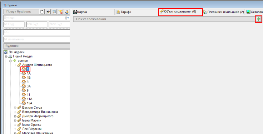 2) Вибрати потрібний будинок, перейти на вкладку “Об’єкт споживання”, натиснути кнопку “+” :
