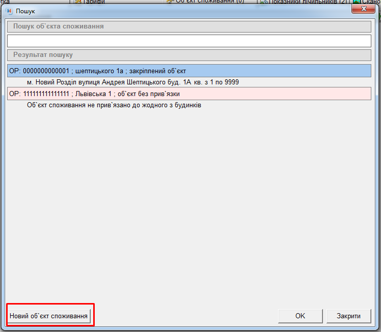 3) натиснути кнопку “Новий об’єкт споживання”, відкриється вікно: