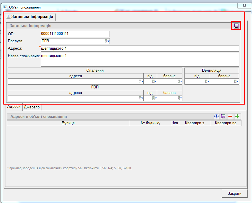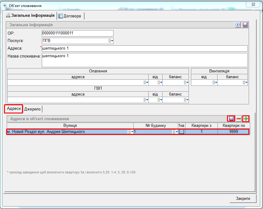 Далі у вкладці “Адреси” нажати кнопку “+”, проставити Адреси в об’єкті споживання, та натиснути кнопку “дискета” (зберегти)