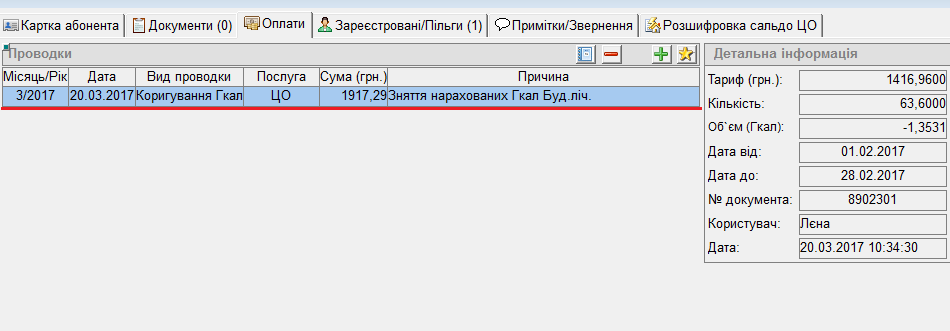 В картці ОР (даного будинку, по якому робили обнулення показника будинкового лічильника), у вкладці "Оплати" буде створена проводка"Коригування Гкал"