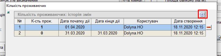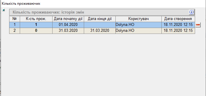 * у вікні "Кількість проживаючих" нажати на кнопку "і" відкриється вікно "Історія видалень":