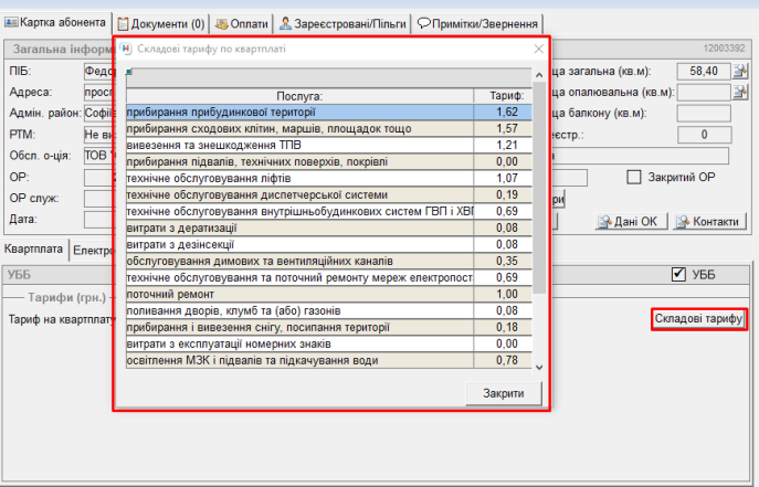 Вибрати послугу "Квартплата" - натиснути кнопку "Складові тарифу" - відкриється вікно з переліком послуг, які входять у ціну тарифу по особовому рахунку