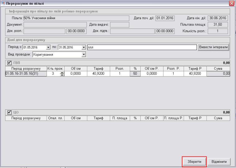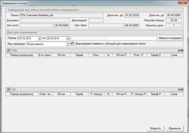 У вікні для перерахунку по пільзі автоматично підтягується інформація що заведена по пільзі: назва пільги, документ на пільгу, пільгова площа, дата початку дії та інше.