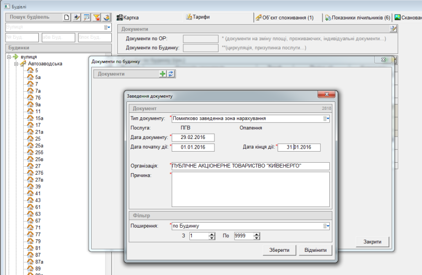 (Абонентсьий відділ — Будівлі — знаходимо адресу — вкладка "Тарифи" - нажимаємо кнопку "Листок з ручкою" - у вікні "Документи по будинку" нажимаємо "+")