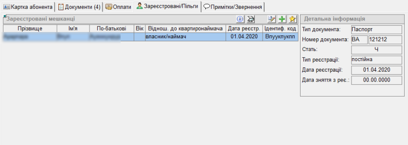 У вкладці відображений список вже зареєстрованих мешканців по обраній адресі. Справа від них — детальна інформація по кожному мешканцю (паспорт/ стать, дата реєстрації по даному ОР, якщо є, то дата зняття з реєстрації)