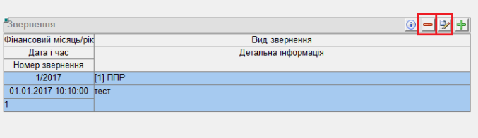 Для того, щоб видалити Звернення — виділити потрібний запис(звернення) і нажати на кнопку мінус "-".