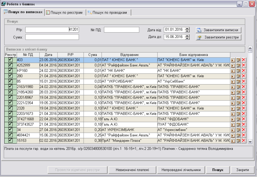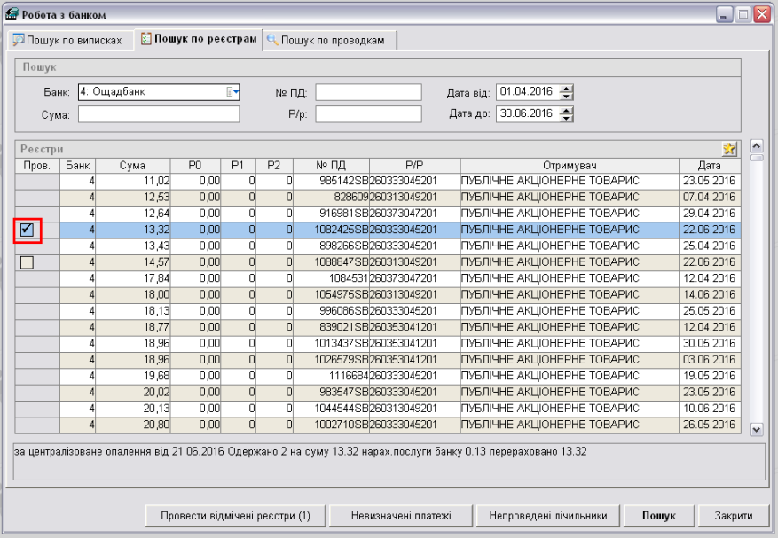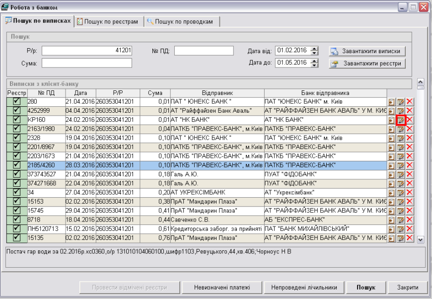 Якщо напроти платіжного документу стоїть галочка, це означає, що під ці платіжні документи створено реєстр, якщо стоїть галочка виділена зеленим фоном — ці кошти рознесено на абонента.