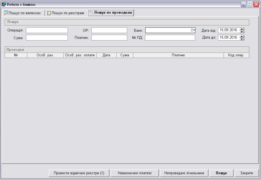 "Пошук по проводкам" - пошук проводок по конкретним параметрам ( Операція, сума, ОР, платник, банк, № ПД, дата від...до.. ) - нажимаємо "Пошук".