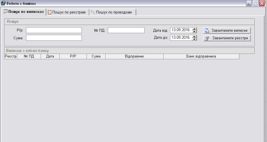 Одразу відкривається на вкладці Пошук по виписках, по яким можна знайти електронні оплати, якщо ввести в пошук відомі вам дані: розрахунковий рахунок, суму, номер платіжного доручення, область дат. Після цього, нажати на кнопку "Пошук" і у вікні будуть відображені необхідні виписки з клієнт банку по заданим параметрам.