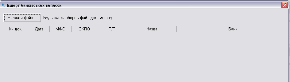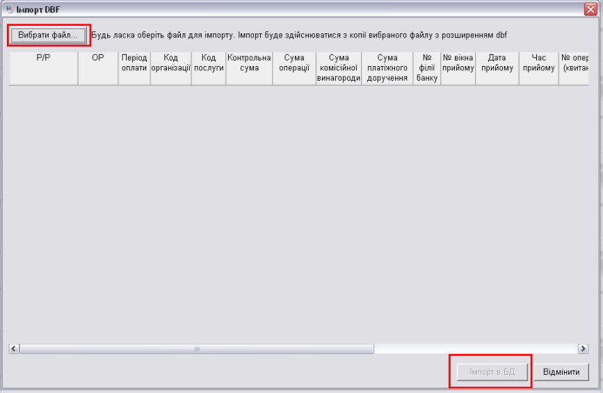 "Вибрати файл" — обираємо шлях, де знаходиться необхіднийфайл (формату dbf) та нажати — "Імпорт до бази даних". Після імпорту, відкриється вікно з результатом завантаження (список платіжних документів).
