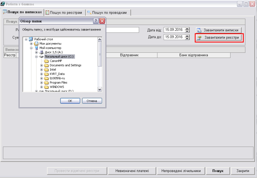 вибрати потрібний шлях до папки з файлами реєстрів, нажати ОК, в результаті будуть завантажені реєстри під відповідні платіжні документи.