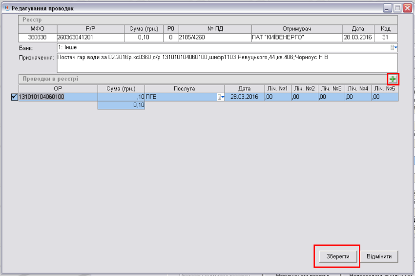 далі вносимо інформацію по платежам відповідно реєстрам (особовий рахунок, суму) і нажати "Зберегти".