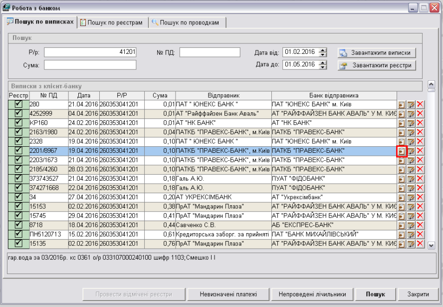 2) Створення реєстру вручну. Шукаємо платіжні документи, по яким треба занести: у вікні "Робота з банком" вводимо точні дані, які відомі (Рр, сума, №ПД, Датавід.. до) і нажимаємо "Пошук", після чого отримаємо список платіжних документів. Далі нажати на кнопку "листок з ручкою"