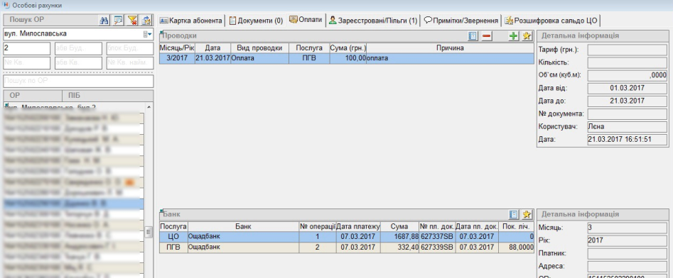 Абонентський відділ → Особові рахунки (знайти необхідний ор) → перейти на вкладку "Оплати":