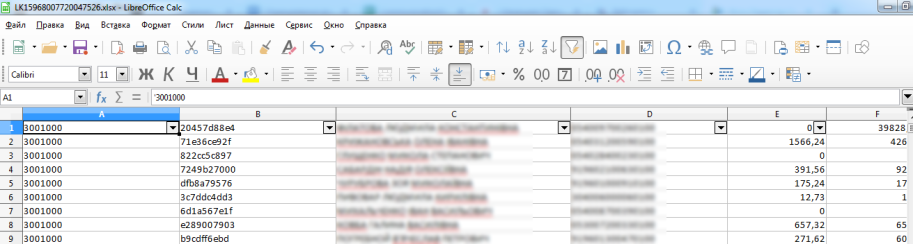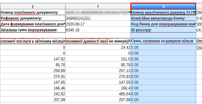 а якщо у колонці G, суми через крапку, тоді потрібно виділити колонку “G” (Сума сплачена за рахунок пільги/субсидії), клацнувши один раз по назві (G) цієї колонки лівою кнопкою миші: