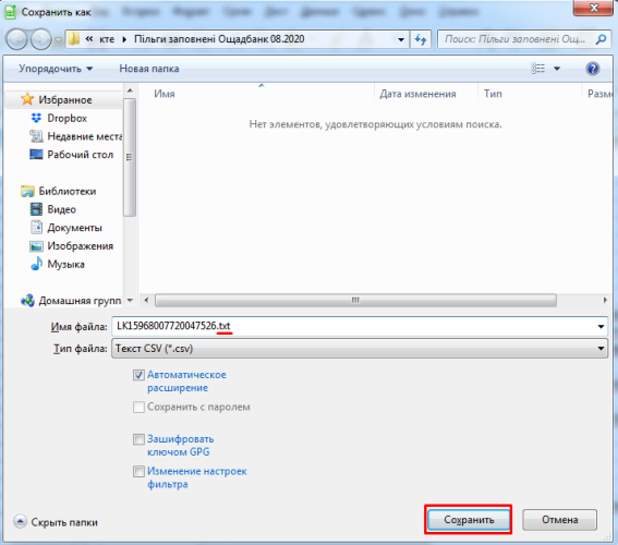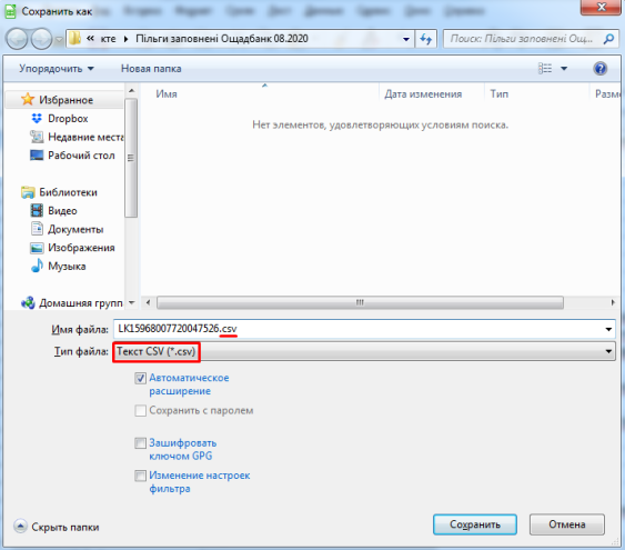 - у полі “Имя файла” змінюємо “csv” на “txt”, та натискаємо “Сохранить”: