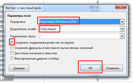 - далі відкриється вікно, у якому у полях “Кодировка” та “Разделитель полей” поставити такі ж значення як на зображенні нижче, та поставити “галочку” біля поля “Сохранять содержимое ячеек как на экране” та натиснути «ОК»