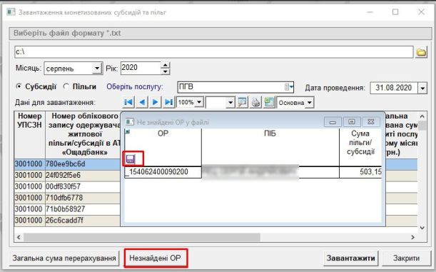 - натиснути на «Незнайдені ор», після чого відкриється список не знайдених особових рахунків