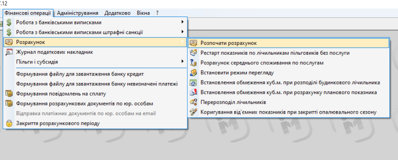 Для нарахування по послугам за поточний фінансовий місяць в меню Фінансові операції — Розрахунок, вибираємо пункт — Розпочати розрахунок