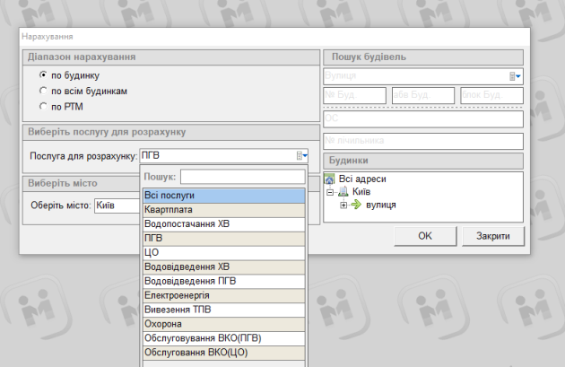 Наприклад, якщо робимо нарахування по будинку, справа у вікні "Пошук будівель" вибираємо адресу і нажимаємо "ОК", після чого нарахування буде зроблене і вікно "Нарахування" автоматично закриється.