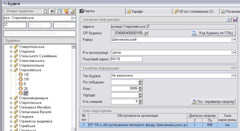 В правій частині вкладки "Будівлі" відображено картку з загальною та технічною інформацією по будинку. В лівій частині - відображено перелік адрес з номерами будинків.