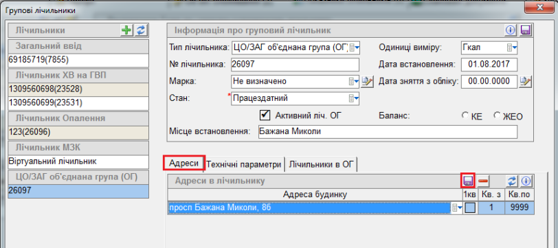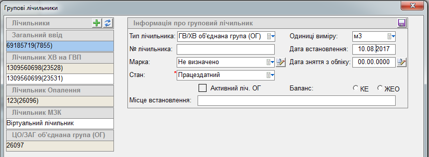 2) нажати на кнопку "лупа", далі у вікні "Групові лічильники" нажати на кнопку "+" заповнити потрібну інформацію та нажати Зберегти (дискета). Такі поля, як № лічильника, Одиниці виміру та Марка - заповнюються автоматично. Є можливість вибрати активний лічильник або неактивний.