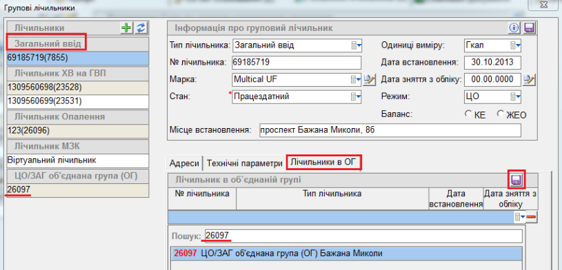 - у пошуку ввести ай ді лічильника, який потрібно прив'язати до ОГ, його вибрати та нажати Зберегти.