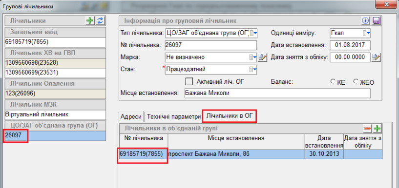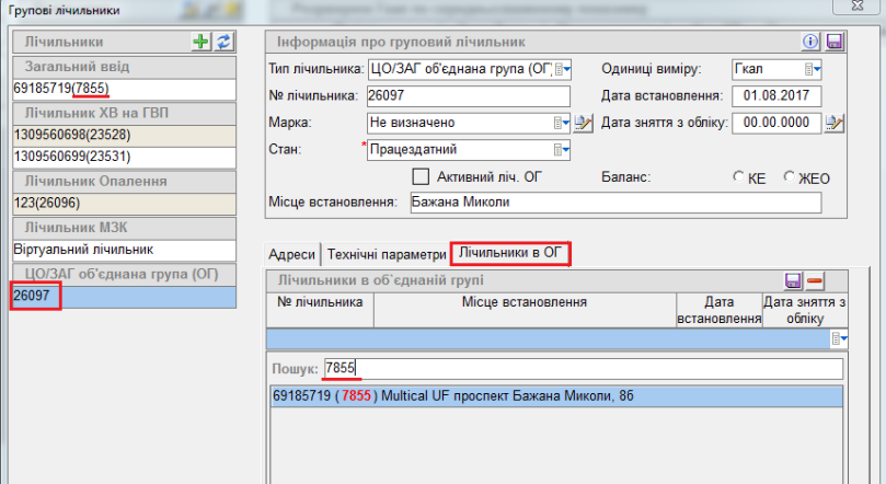 Щоб подивитись, до якого ліч. ОГ прив'язаний підлічильник, вибрати потрібний, у вкладці "Лічильники в ОГ" відображено, до якого Ліч ОГ він прив'язаний:
