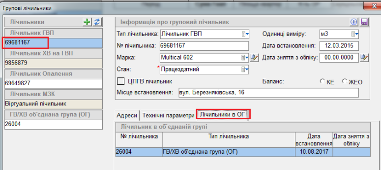 Всі лічильники, які прив'язали до ліч. ОГ, будуть відображені у вкладці "Лічильники в ОГ", також, є можливість видалити прив'язку лічильника, для цього вибрати з списку потрібний та нажати на кнопку "-" :