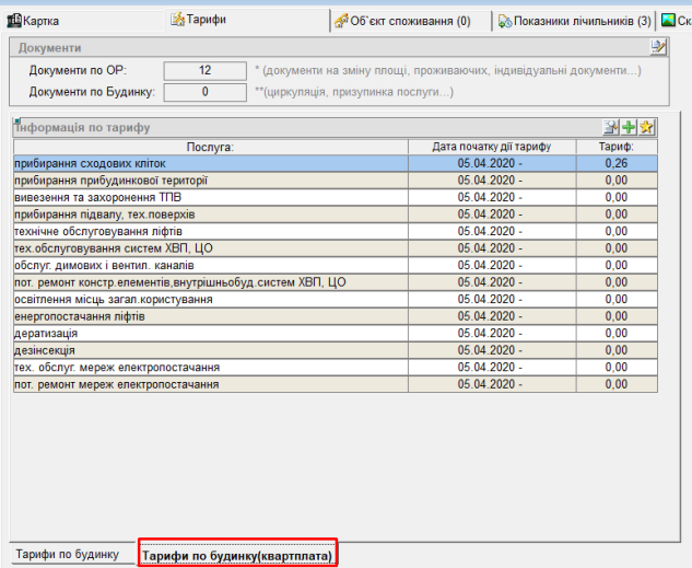 На вкладці "Тарифи по будинку(квартплата)" відображено заведений поточний тариф по квартплаті у розрізі послуг: