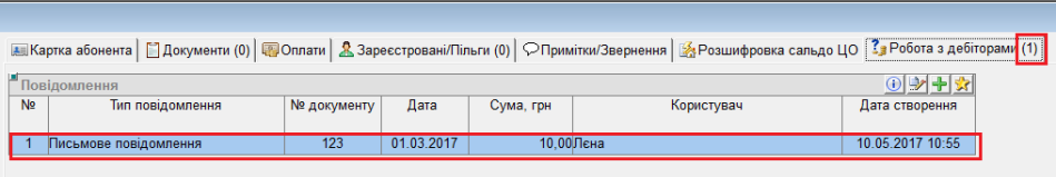 Після збереження, автоматично до такого запису додається інформація про користувача, який додав запис та дата створення запису; біля назви вкладки "Робота з дебіторами" буде візуалізація з відміткою про наявність повідомлення (і к-сть створених повідомлень)