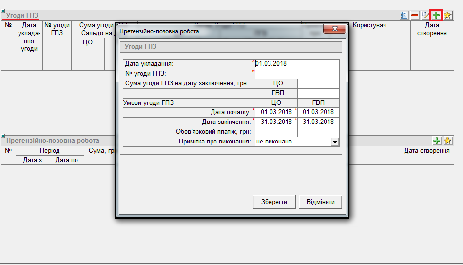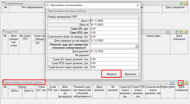 - у блоці "Претензійно - позовна робота" нажати кнопку "+", відкриється вікно для створення ППР