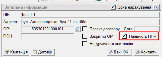 Після збереження, автоматично до такого запису додається інформація про користувача, який додав запис та дата створення запису; в "Особові рахунки" в "Картка абонента" в "Загальна інформація" буде відмітка про наявність ППР
