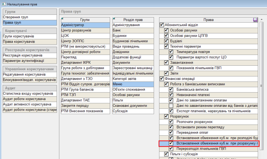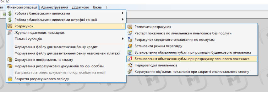 Для того, щоб "встановити обмеження куб.м при розрахунку планового показника", у меню: Фінансові операції — Розрахунок - Встановлення обмеження куб.м при розрахунку планового показника: