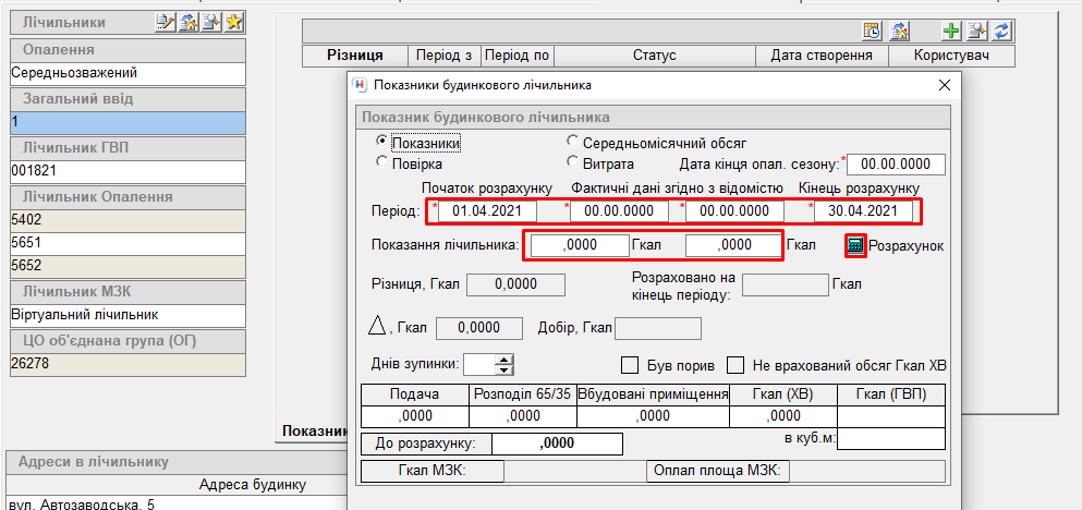 У вікні "Показники будинкового лічильника" заповнити Період, показники лічильника (з.. та по..), нажати кнопку "розрахунок", після чого автоматично розрахуються остальні дані; та нажати Зберегти. Різниця підрахується автоматично