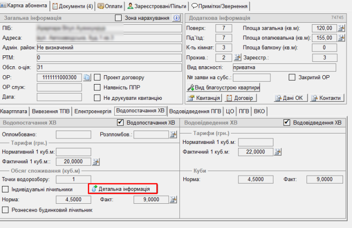 Для заведення лічильників та показників: вибрати послугу, натиснути кнопку "Детальна інформація":