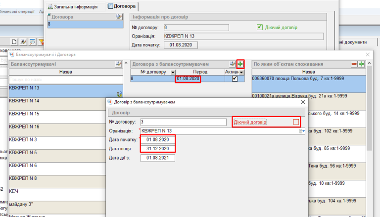 - далі у колонці "договора з балансоутримувачем" натиснути "+", та завести договір з КВЖРЕП №13 з датою початку - з якої діє діючий договір(на прикладі з 01.08.2020) та датою кінця дії, забираємо галочку біля поля "діючий договір", зберігаємо