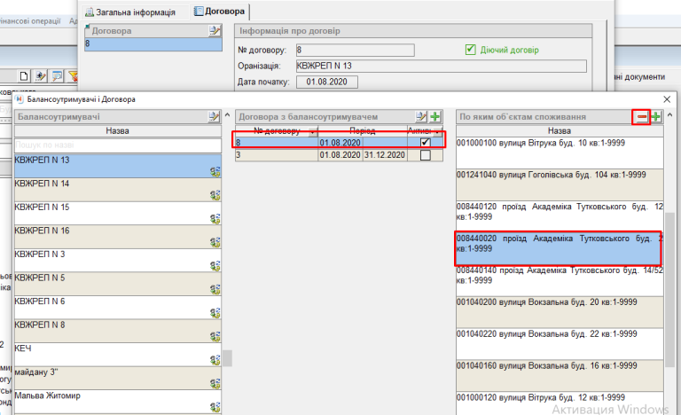 - далі вибираємо активний договір, у колонці "По яким об'єктам споживання" вибираємо будинок "Академіка Тутковського 2" та нажимаємо кнопку "-" (видалити):