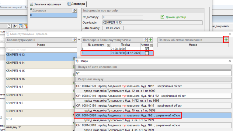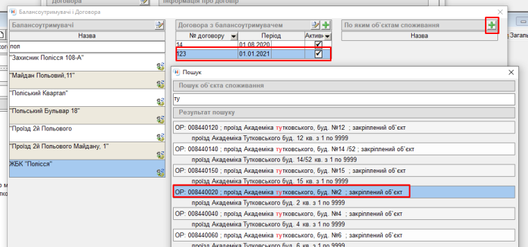 - далі до цього договору, у колонці "По яким об'єктам споживання" нажимаємо "+", та прив'язуємо будинок Академіка Тутковського 2
