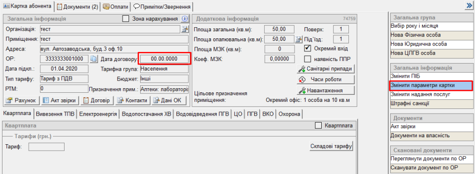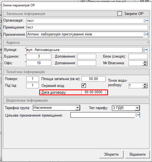 відкриється вікно “Зміна параметрів ОР”, у даному вікні змінити дату договору та нажати “Зберегти”: