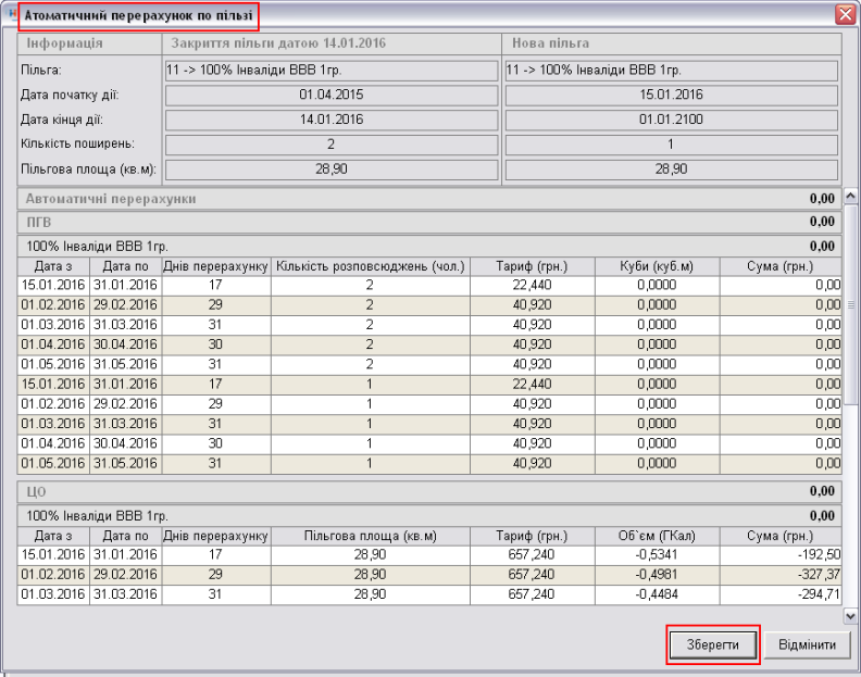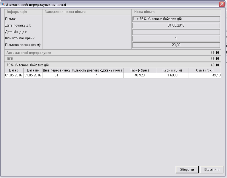 Для того щоб змінити "дату початку дії" або "дату кінця дії" існуючої пільги, нажати на пільгу подвійним кліком миші, зробити потрібні зміни, нажати Зберегти, і програма запропонує автоматичний перерахунок по пільзі, нажати Зберегти.